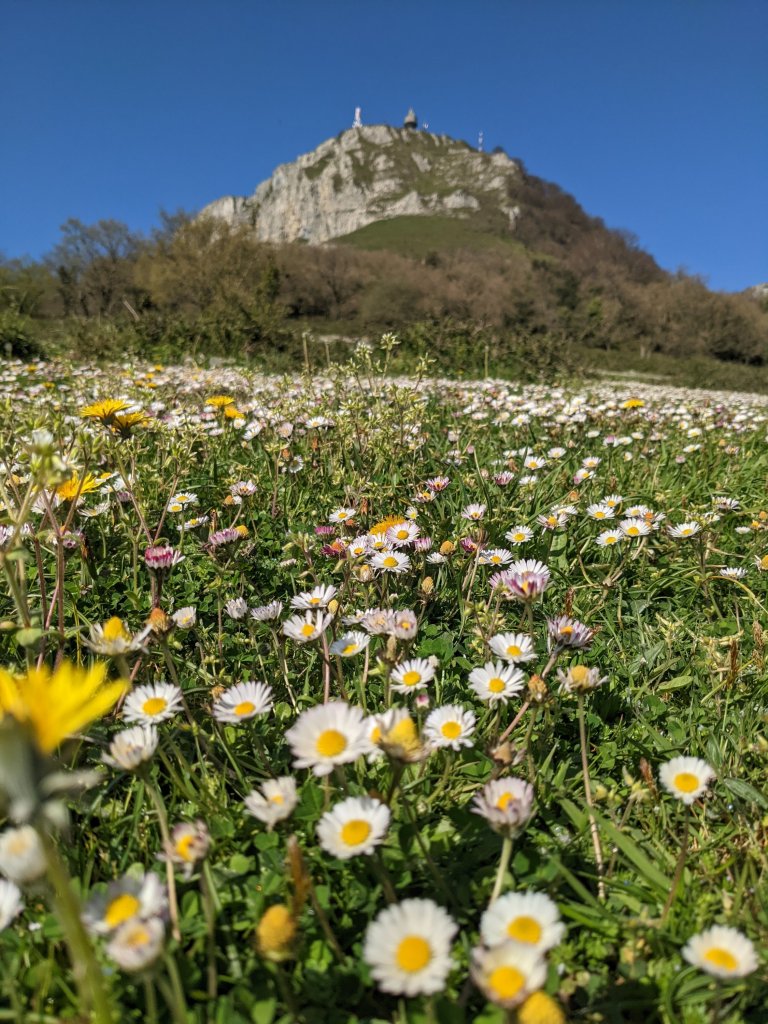Ya por fin llegó la primavera aquí arriba. Las praderas se margaritas te acompañan hasta donde la roca ya no las deja avanzar.