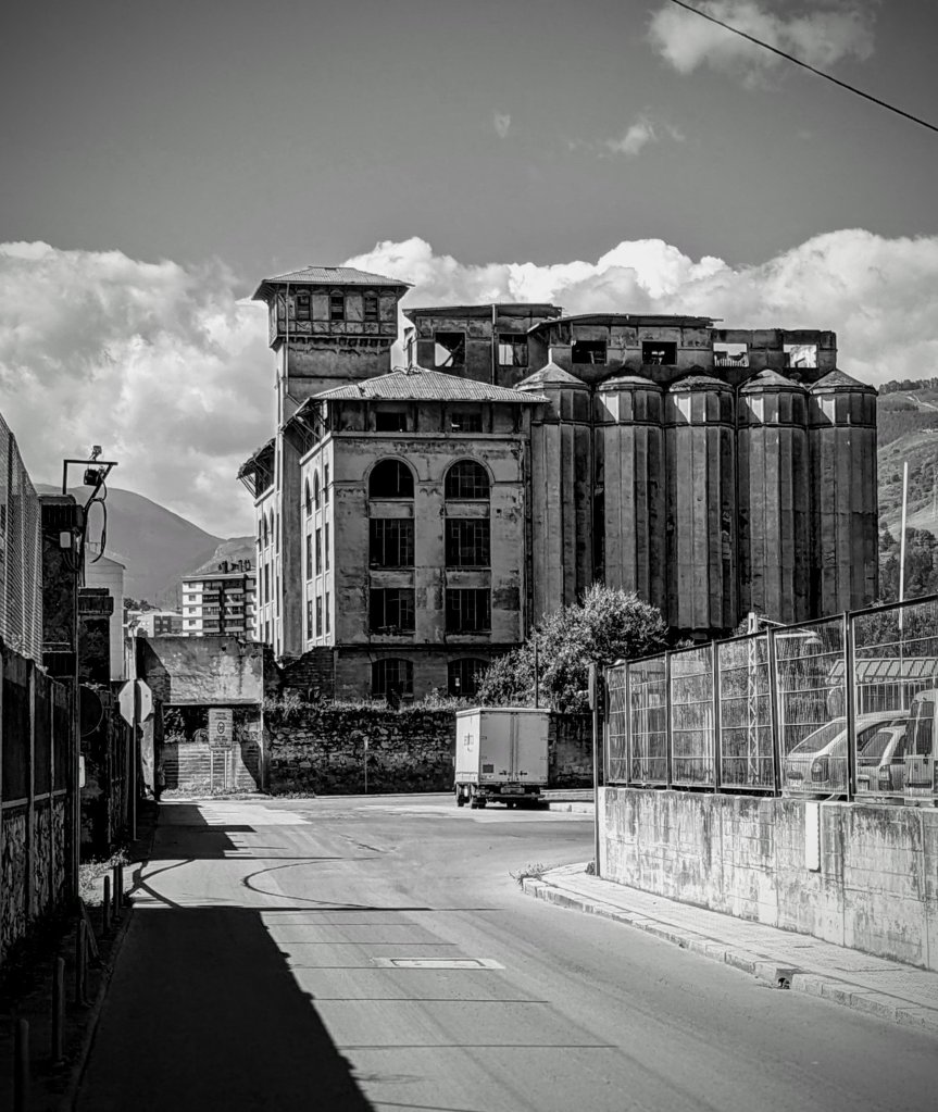 Este edificio es la antigua harinera de la ciudad y siempre la he fotografiado desde el otro lado de la ría, que es la toma habitual, pero no salían los depósitos y el sábado la tomé desde aquí.