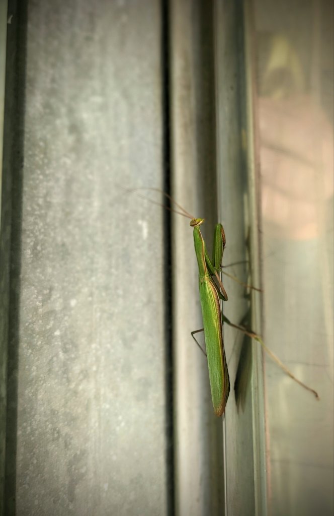 Viendo las fotos de la exposición de Norman Foster del Guggenheim, he visto esta que no recordaba. Cuando entrábamos por la puerta del museo, mi hijo pequeño se detuvo y nos llamó. Había visto la mantis en el borde de la puerta y nadie se había dado cuenta de su presencia.