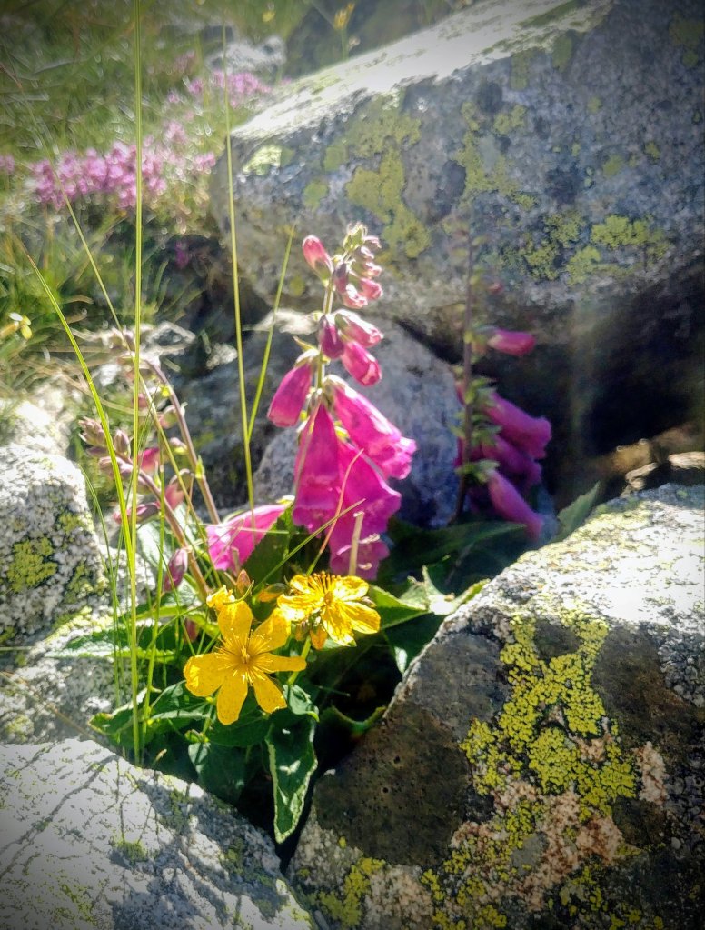 A 2400 mts los árboles y la vegetación van desapareciendo, pero siempre cobijadas entre rocas aparece algún hipérico. Y eso significa que es verano.