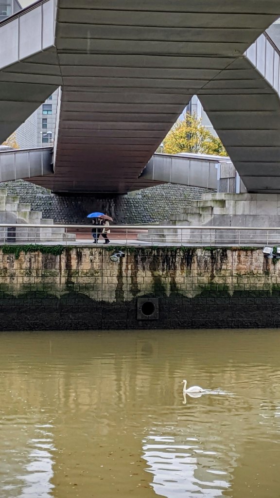 Una foto ‘strana’ nel contrasto tra la pesantezza del fiume e la bianca eleganza del cigno.